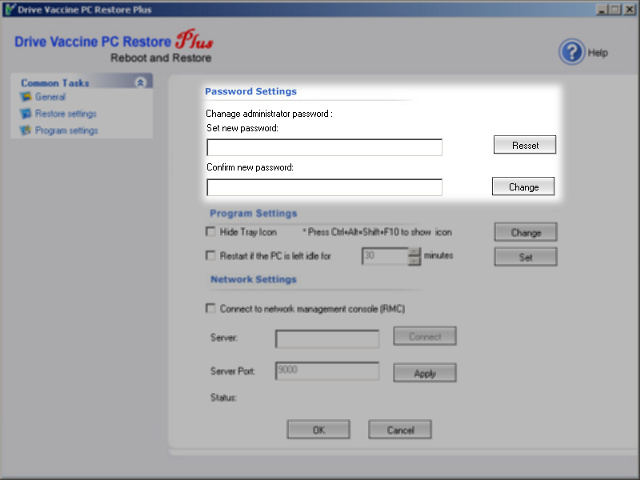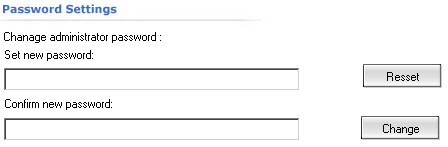 In this section of the program you can change you password to a new one. For security reasons the new password will be shown as stars and you will have to enter it twice. To set the new password click on the "Change" button. To clear the textboxes click the "Reset" button.