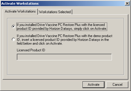 This option lets you quickly activate Drive Vaccine PC Restore Plus on many computers. If you have installed Drive Vaccine PC Restore Plus using the demo key, you must click the bottom radio button and enter a key provided to you by Horizon DataSys into the textbox. Clicking on "Activate" will start the activation process for the target computers
