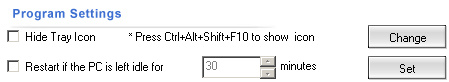 To hide the tray icon, tick the "Hide Tray Icon" checkbox and confirm by clicking the "Set" button. You can get the icon to show again if you press the Ctrl, Alt, Shift and F10 keys together.